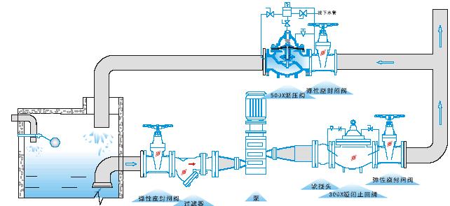 【产品名称:持压/泄压阀】 【产品型号:500X】 【产品介绍】: 500X持压/泄压阀利用水力自动操作,即可以作泄压阀用又可作持压阀用。作泄压阀用时,可维持供水路压力在设定的安全值之下;做持压阀用,可维持主阀上游水压在设定值之上,保持主阀上游供水压力。 【工作原理】: 作泄压阀:当泄压/持压导阀调整为泄压状态时,水通过针阀、主阀控制室、球阀、泄压/持压导阀、流向出口,此时主阀处于开启状态。当进口压力超过泄压/持压导阀设定的安全值时,泄压导阀会自动开启,通过球阀放出部分水,使管路泄压。当压力恢复到安全值时,泄压阀自动关闭。 作持压阀:当泄压/持压导阀调整为持压状态时,只要主阀进口水压低于导阀设定值,导阀即关闭。主要控制室升压,主阀关闭。当主阀上游供水压力超过导阀设定压力时,持压导阀才能打开,控制室的水经球阀排至出口,控制室降压主阀开启,开始供水,即保持了上游水压。作持压阀用时,球阀常闭或用丝堵换下。 【产品特点】: 1、维护、调试、检查方便、密封可靠,使用寿命长。 2、阀体采用全通道流线型直流式设计,液体阻力小,流量大。 3、利用水力自力控制,不需要其它装置和能源,保养简便,一阀多用。 【产品尺寸】:
