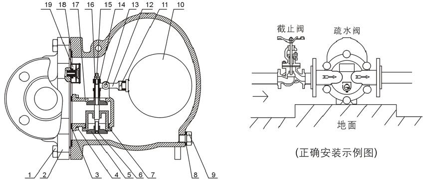 序号 | 名称 | 材料 | 1 | 阀盖螺栓 | 铸钢 | 2 | 阀盖 | 铸钢 | 3 | 阀座垫圈 | 石墨 | 4 | 阀座螺栓 | 不锈钢 | 5 | 阀芯 | 不锈钢 | 6 | 螺母 | 不锈钢 | 7 | 下阀座 | 不锈钢 | 8 | 排污垫圈 | 不锈钢 | 9 | 排污螺塞 | 铸钢 | 10 | 浮球阀 | 不锈钢 | 11 | 螺栓 | 不锈钢 | 12 | 杠杆 | 不锈钢 | 13 | 连接杆 | 不锈钢 | 14 | 杠杆连接杆 | 不锈钢 | 15 | 阀芯连接杆 | 不锈钢 | 16 | 螺母 | 不锈钢 | 17 | 上阀座 | 不锈钢 | 18 | 阀盖垫圈 | 不锈钢 | 19 | 膜盒排气组件 | 不锈钢 |
