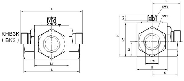 | 简略型号 | PN(bar) | DN | LW | RA | d1 | i | L | L1 | B | H | h1 | h2 | h3 | SW1 | SW2 | S | | KHB3K-NPT1/8 | 500 | 04 | 06 | / | NPT1/8 | 10 | 69 | 40 | 26 | 45 | 13.5 | 33 | 8 | 09 | 22 | 35 | | KHB3K-NPT1/4 | 500 | 06 | 06 | / | NPT1/4 | 14 | 69 | 40 | 26 | 45 | 13.5 | 33 | 8 | 09 | 22 | 35 | | KHB3K-NPT3/8 | 500 | 10 | 10 | / | NPT3/8 | 14 | 72 | 42 | 32 | 49 | 16 | 36 | 10 | 09 | 27 | 36 | | KHB3K-NPT1/2 | 500 | 13 | 12 | / | NPT1/2 | 16 | 83 | 48 | 35 | 49 | 17 | 40 | 10 | 09 | 30 | 40 | | KHB3K-NPT1/2 | 400 | 16 | 15 | / | NPT1/2 | 16 | 83 | 48 | 38 | 61 | 19 | 45 | 11 | 09 | 32 | 42 | | KHB3K-NPT3/4 | 315 | 20 | 20 | / | NPT3/4 | 18 | 95 | 60 | 48 | 70 | 25 | 55 | 11 | 12 | 41 | 49 | | KHB3K-NPT1 | 315 | 25 | 25 | / | NPT1 | 21 | 113 | 65 | 57 | 79 | 28.5 | 64 | 11 | 12 | 50 | 56.5 | | KHB3K-NPT 11/4 | 315 | 32 | 32 | / | NPT 11/4 | 22 | 110 | 84 | 75 | 101 | 37.5 | 84 | 12 | 14 | 60 | 62.5 | | KHB3K-NPT 11/2 | 315 | 40 | 38 | / | NPT 11/2 | 24 | 130 | 91 | 85 | 112 | 42.5 | 95 | 12 | 14 | 70 | 61 | | KHB3K-NPT2 | 315 | 50 | 48 | / | NPT2 | 26 | 140 | 100 | 105 | 131 | 52.5 | 112 | 12 | 14 | 80 | 62.5 |